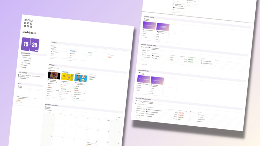 All-in-one dashboard Notion template helps graphic designers manage clients, projects, tasks, invoices, incomes/expenses, goals, digital portfolios, and more. It's easy to use, affordable, and packed with features that will help you stay organized, productive, and creative.